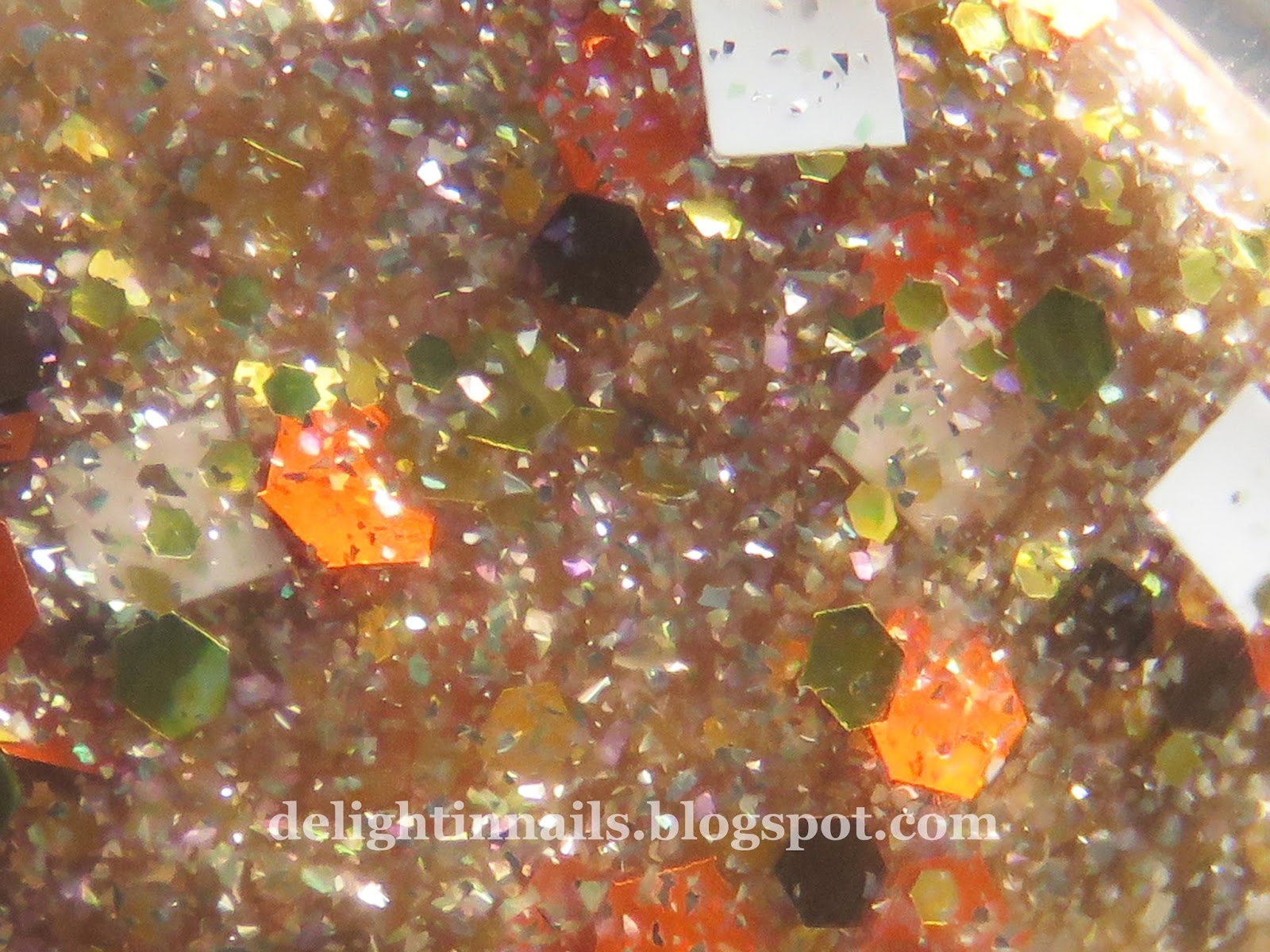 The other polish I received is called Caramel Forest. It is a glitter topper with orange metallic hexes, large white squares, small black and gold hexes, and gold flakies and shimmer. It is shown here over Rainbow Honey Mr. Saturn. It's super sparkly in person. I did two coats and then added topcoat.